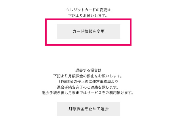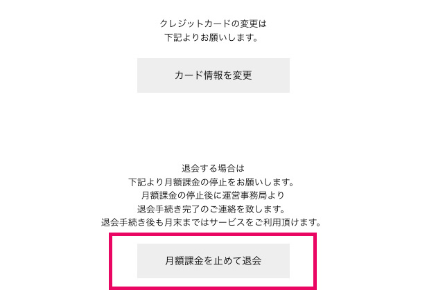 ①ログイン後に「マイページのアカウント」にある、カード情報の「月額課金を止めて退会」ボタンより退会申請をしてください。