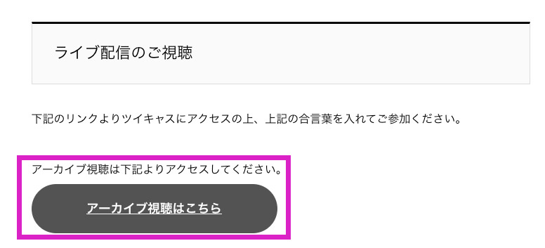 必ずアーカイブはライブ配信の合言葉ページの下部に配置しております「灰色ボタン」のリンクよりご確認ください。